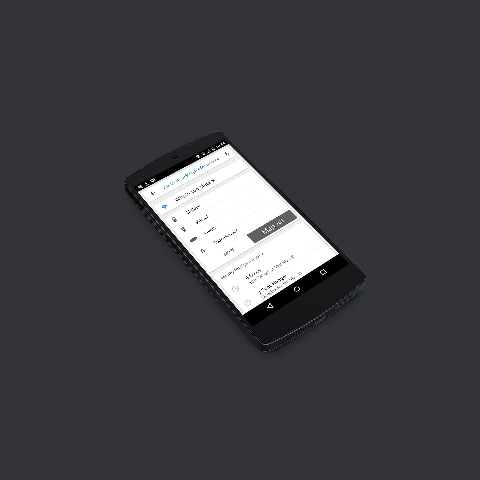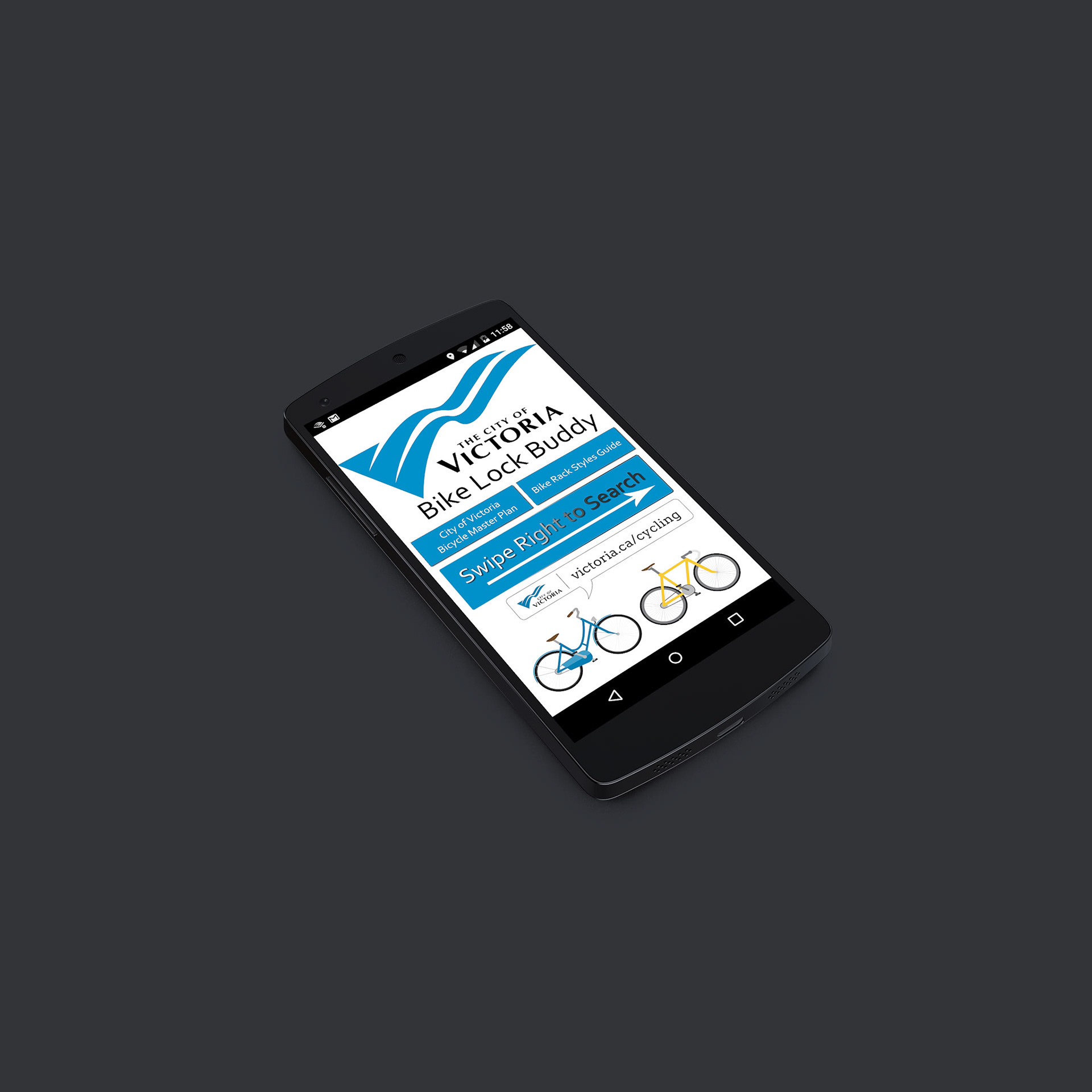 A concept design for an App that helps locate secure locations to lock one's bike. Designed for a class at the University of Victoria.